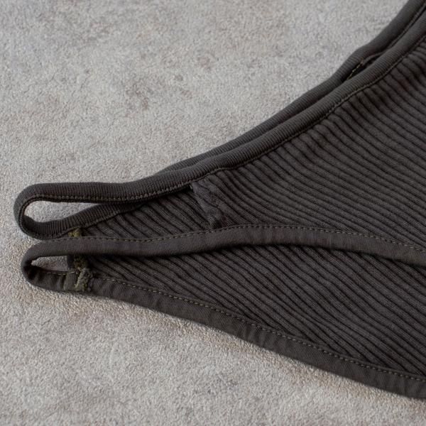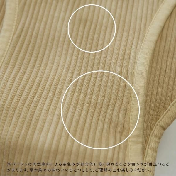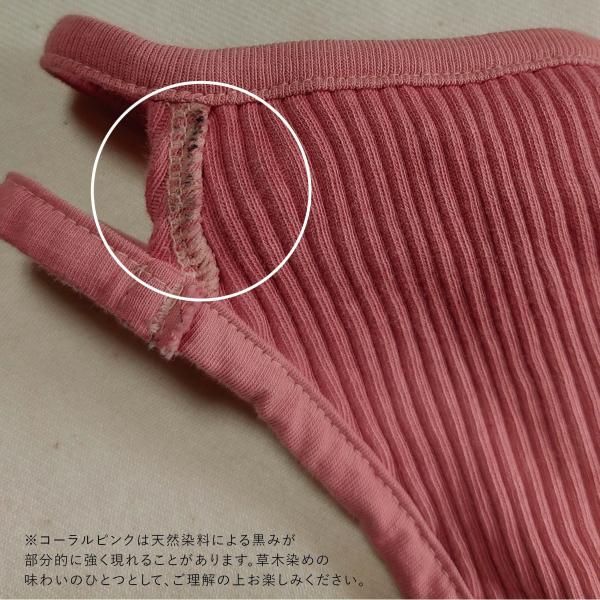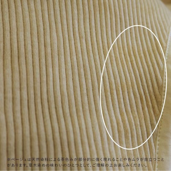 その染料の特性により、リブ素材部分に茶色みが強く出た部分や、全体的に色の濃淡が生じることがあります。自然素材だからこそ生まれる風合いとして、ご理解のうえお楽しみください。(汚れではありません)